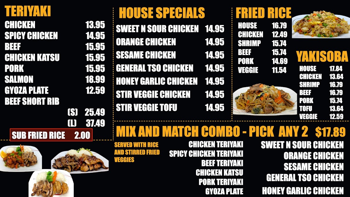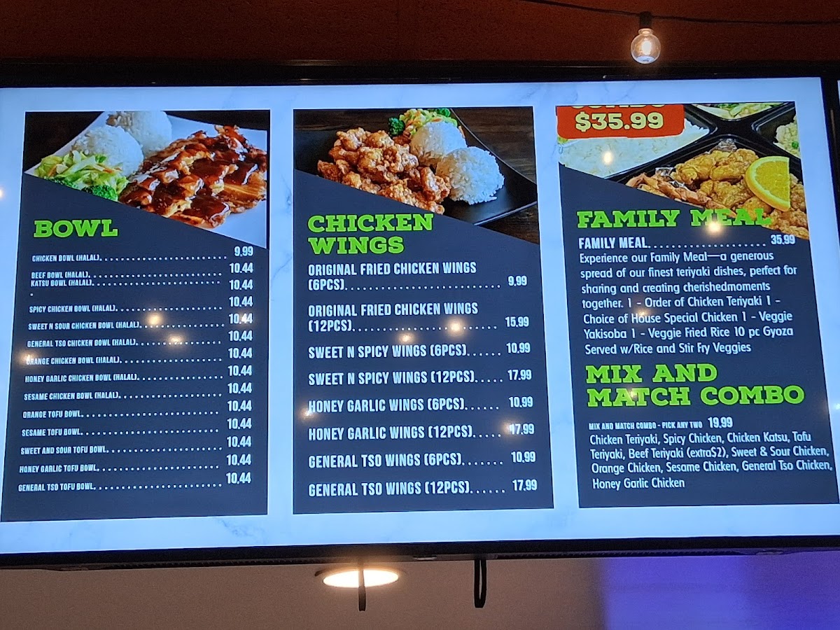 Experience our Family Meal—a generous spread of our finest teriyaki dishes, perfect for sharing and creating cherishedmoments together. 1 - Order of Chicken Teriyaki 1 - Choice of House Special Chicken 1 - Veggie Yakisoba 1 - Veggie Fried Rice 4 ...